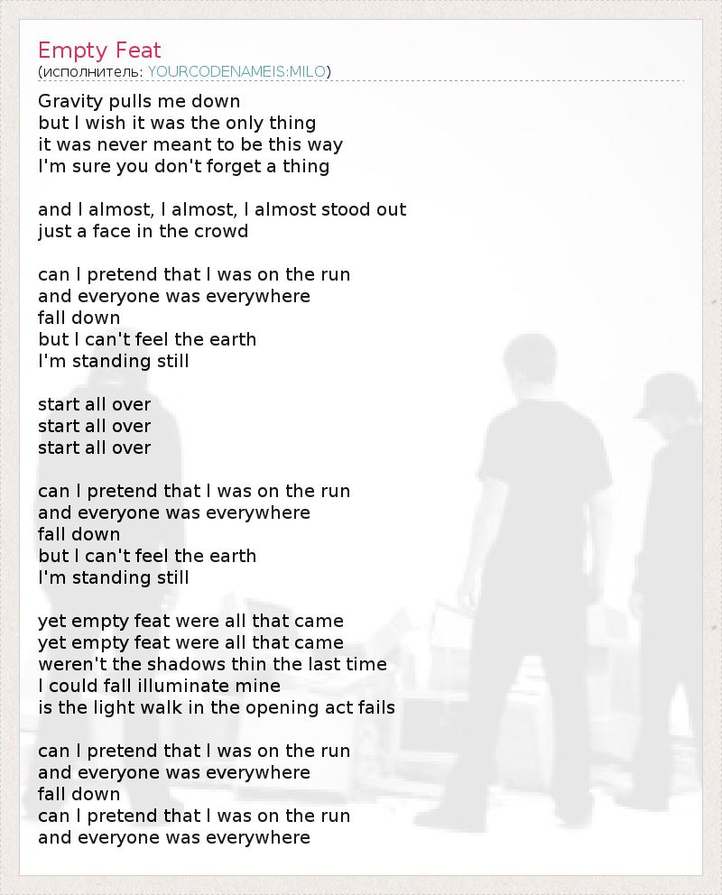 Gravity pulls me down but I wish it was the only thing it was never meant to be this way I'm sure you don't forget a thing and I almost, I almost, I almost stood out just a face in the crowd can I pretend that I was on the run and everyone was everywhere fall down but I can't feel the earth I'm standing still start all over start all over start all over can I pretend that I was on the run and everyone was everywhere fall down but I can't feel the earth I'm standing still yet empty feat were all that came yet empty feat were all that came weren't the shadows thin the last time I could fall illuminate mine is the light walk in the opening act fails can I pretend that I was on the run and everyone was everywhere fall down can I pretend that I was on the run and everyone was everywhere