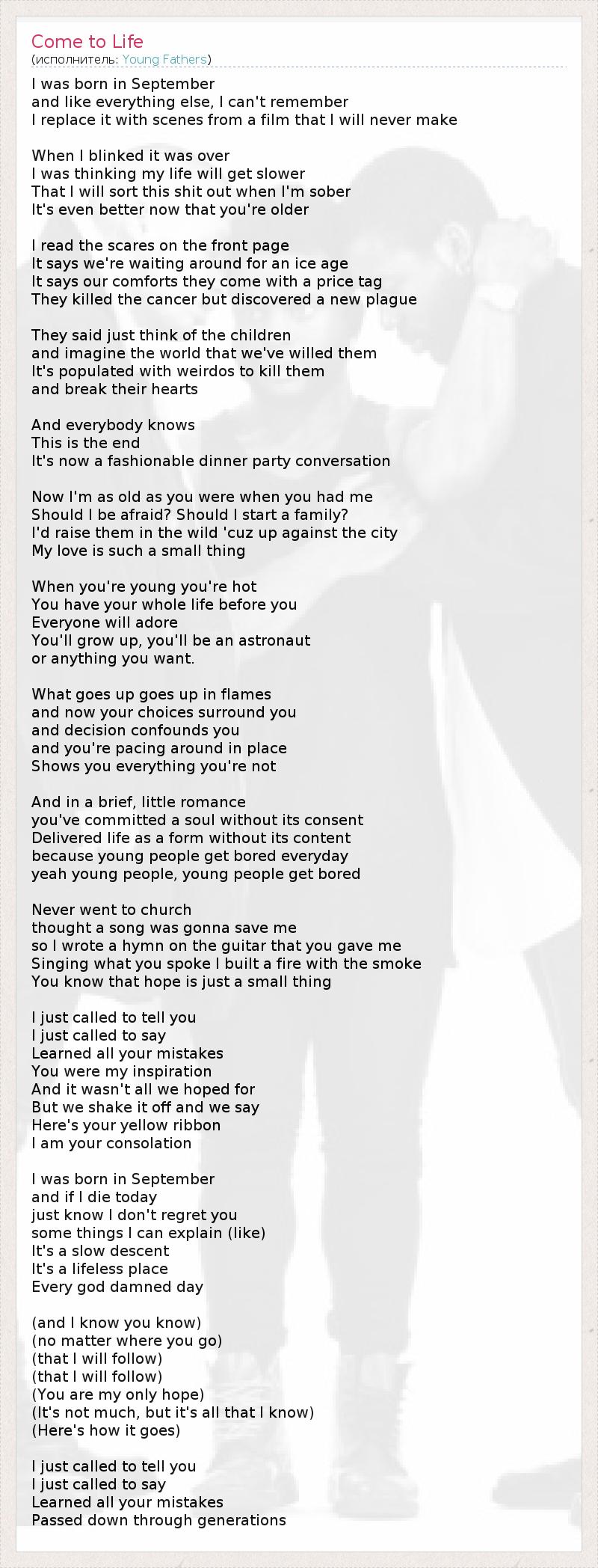 I was born in September and like everything else, I can't remember I replace it with scenes from a film that I will never make When I blinked it was over I was thinking my life will get slower That I will sort this shit out when I'm sober It's even better now that you're older I read the scares on the front page It says we're waiting around for an ice age It says our comforts they come with a price tag They killed the cancer but discovered a new plague They said just think of the children and imagine the world that we've willed them It's populated with weirdos to kill them and break their hearts And everybody knows This is the end It's now a fashionable dinner party conversation Now I'm as old as you were when you had me Should I be afraid? Should I start a family? I'd raise them in the wild 'cuz up against the city My love is such a small thing When you're young you're hot You have your whole life before you Everyone will adore You'll grow up, you'll be an astronaut or anything you want. What goes up goes up in flames and now your choices surround you and decision confounds you and you're pacing around in place Shows you everything you're not And in a brief, little romance you've committed a soul without its consent Delivered life as a form without its content because young people get bored everyday yeah young people, young people get bored Never went to church thought a song was gonna save me so I wrote a hymn on the guitar that you gave me Singing what you spoke I built a fire with the smoke You know that hope is just a small thing I just called to tell you I just called to say Learned all your mistakes You were my inspiration And it wasn't all we hoped for But we shake it off and we say Here's your yellow ribbon I am your consolation I was born in September and if I die today just know I don't regret you some things I can explain (like) It's a slow descent It's a lifeless place Every god damned day (and I know you know) (no matter where you go) (that I will follow) (that I will follow) (You are my only hope) (It's not much, but it's all that I know) (Here's how it goes) I just called to tell you I just called to say Learned all your mistakes Passed down through generations