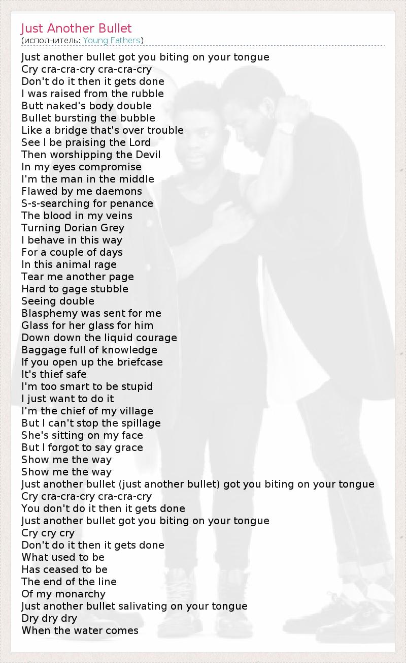Just another bullet got you biting on your tongue Cry cra-cra-cry cra-cra-cry Don't do it then it gets done I was raised from the rubble Butt naked's body double Bullet bursting the bubble Like a bridge that's over trouble See I be praising the Lord Then worshipping the Devil In my eyes compromise I'm the man in the middle Flawed by me daemons S-s-searching for penance The blood in my veins Turning Dorian Grey I behave in this way For a couple of days In this animal rage Tear me another page Hard to gage stubble Seeing double Blasphemy was sent for me Glass for her glass for him Down down the liquid courage Baggage full of knowledge If you open up the briefcase It's thief safe I'm too smart to be stupid I just want to do it I'm the chief of my village But I can't stop the spillage She's sitting on my face But I forgot to say grace Show me the way Show me the way Just another bullet (just another bullet) got you biting on your tongue Cry cra-cra-cry cra-cra-cry You don't do it then it gets done Just another bullet got you biting on your tongue Cry cry cry Don't do it then it gets done What used to be Has ceased to be The end of the line Of my monarchy Just another bullet salivating on your tongue Dry dry dry When the water comes
