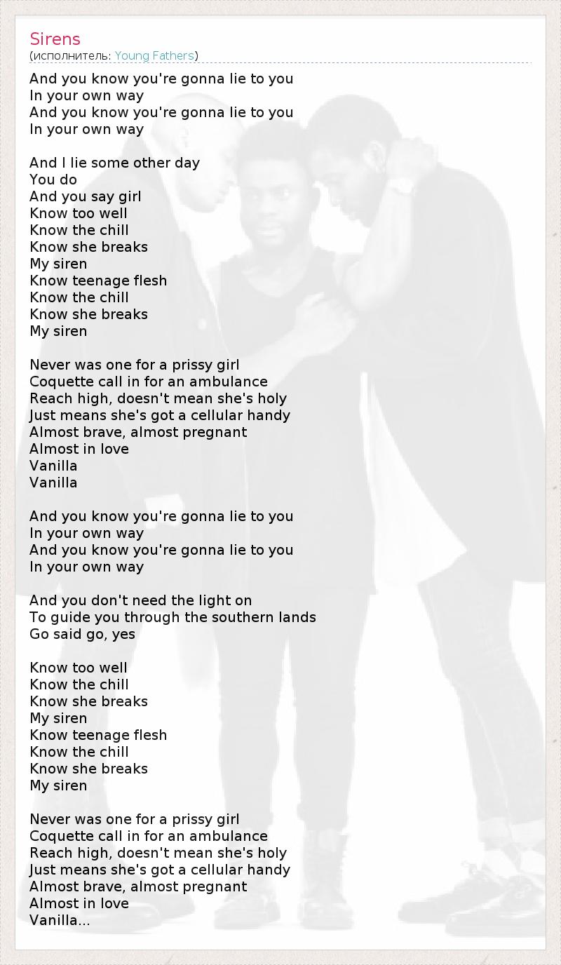 And you know you're gonna lie to you In your own way And you know you're gonna lie to you In your own way And I lie some other day You do And you say girl Know too well Know the chill Know she breaks My siren Know teenage flesh Know the chill Know she breaks My siren Never was one for a prissy girl Coquette call in for an ambulance Reach high, doesn't mean she's holy Just means she's got a cellular handy Almost brave, almost pregnant Almost in love Vanilla Vanilla And you know you're gonna lie to you In your own way And you know you're gonna lie to you In your own way And you don't need the light on To guide you through the southern lands Go said go, yes Know too well Know the chill Know she breaks My siren Know teenage flesh Know the chill Know she breaks My siren Never was one for a prissy girl Coquette call in for an ambulance Reach high, doesn't mean she's holy Just means she's got a cellular handy Almost brave, almost pregnant Almost in love Vanilla...