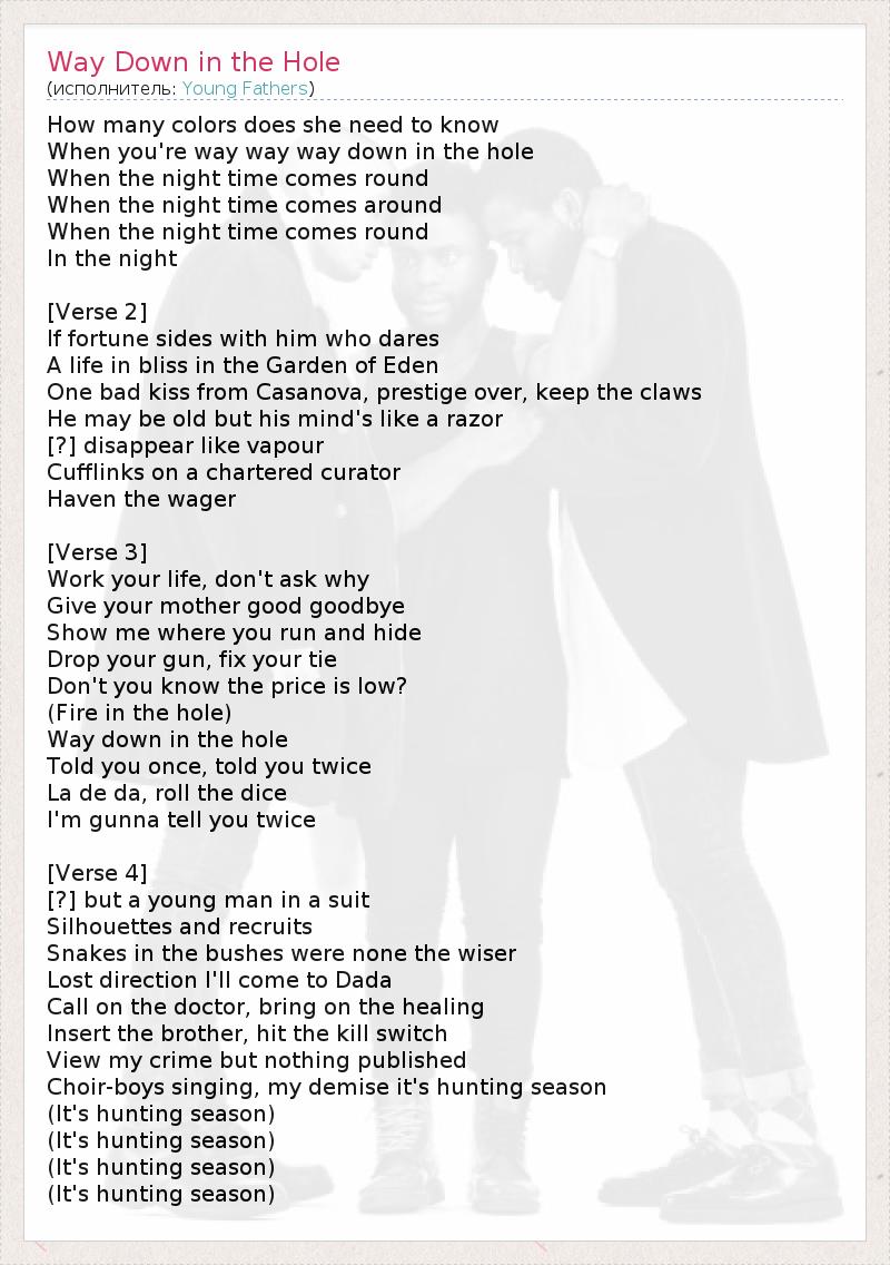 How many colors does she need to know When you're way way way down in the hole When the night time comes round When the night time comes around When the night time comes round In the night [Verse 2] If fortune sides with him who dares A life in bliss in the Garden of Eden One bad kiss from Casanova, prestige over, keep the claws He may be old but his mind's like a razor [?] disappear like vapour Cufflinks on a chartered curator Haven the wager [Verse 3] Work your life, don't ask why Give your mother good goodbye Show me where you run and hide Drop your gun, fix your tie Don't you know the price is low? (Fire in the hole) Way down in the hole Told you once, told you twice La de da, roll the dice I'm gunna tell you twice [Verse 4] [?] but a young man in a suit Silhouettes and recruits Snakes in the bushes were none the wiser Lost direction I'll come to Dada Call on the doctor, bring on the healing Insert the brother, hit the kill switch View my crime but nothing published Choir-boys singing, my demise it's hunting season (It's hunting season) (It's hunting season) (It's hunting season) (It's hunting season)