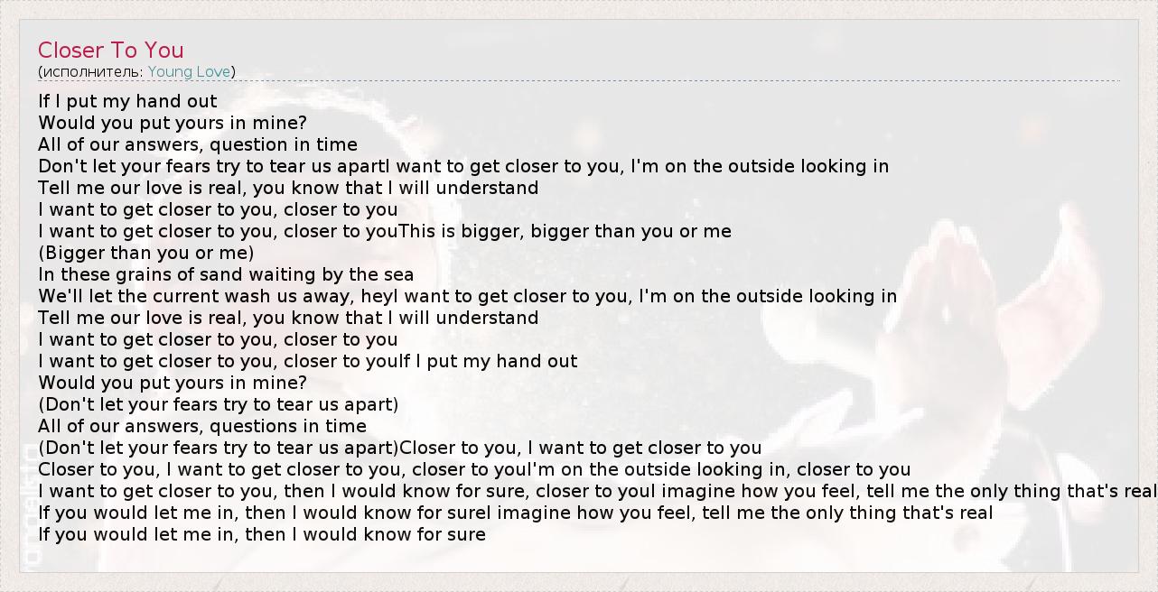 If I put my hand out Would you put yours in mine? All of our answers, question in time Don't let your fears try to tear us apartI want to get closer to you, I'm on the outside looking in Tell me our love is real, you know that I will understand I want to get closer to you, closer to you I want to get closer to you, closer to youThis is bigger, bigger than you or me (Bigger than you or me) In these grains of sand waiting by the sea We'll let the current wash us away, heyI want to get closer to you, I'm on the outside looking in Tell me our love is real, you know that I will understand I want to get closer to you, closer to you I want to get closer to you, closer to youIf I put my hand out Would you put yours in mine? (Don't let your fears try to tear us apart) All of our answers, questions in time (Don't let your fears try to tear us apart)Closer to you, I want to get closer to you Closer to you, I want to get closer to you, closer to youI'm on the outside looking in, closer to you I want to get closer to you, then I would know for sure, closer to youI imagine how you feel, tell me the only thing that's real If you would let me in, then I would know for sureI imagine how you feel, tell me the only thing that's real If you would let me in, then I would know for sure