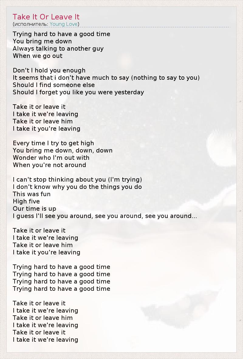 Trying hard to have a good time You bring me down Always talking to another guy When we go out Don't I hold you enough It seems that i don't have much to say (nothing to say to you) Should I find someone else Should I forget you like you were yesterday Take it or leave it I take it we're leaving Take it or leave him I take it you're leaving Every time I try to get high You bring me down, down, down Wonder who I'm out with When you're not around I can't stop thinking about you (I'm trying) I don't know why you do the things you do This was fun High five Our time is up I guess I'll see you around, see you around, see you around... Take it or leave it I take it we're leaving Take it or leave him I take it you're leaving Trying hard to have a good time Trying hard to have a good time Trying hard to have a good time Trying hard to have a good time Take it or leave it I take it we're leaving Take it or leave him I take it we're leaving Take it or leave it I take it we're leaving
