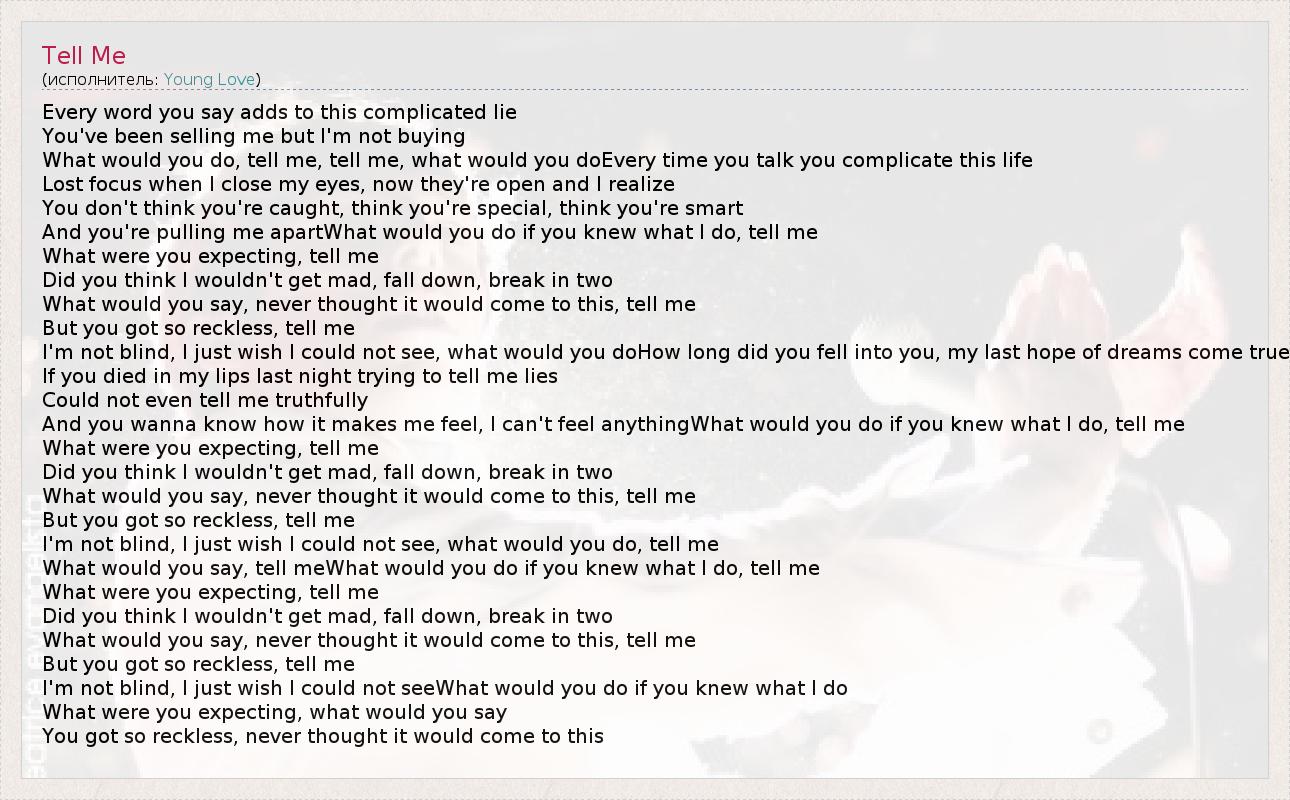 Every word you say adds to this complicated lie You've been selling me but I'm not buying What would you do, tell me, tell me, what would you doEvery time you talk you complicate this life Lost focus when I close my eyes, now they're open and I realize You don't think you're caught, think you're special, think you're smart And you're pulling me apartWhat would you do if you knew what I do, tell me What were you expecting, tell me Did you think I wouldn't get mad, fall down, break in two What would you say, never thought it would come to this, tell me But you got so reckless, tell me I'm not blind, I just wish I could not see, what would you doHow long did you fell into you, my last hope of dreams come true If you died in my lips last night trying to tell me lies Could not even tell me truthfully And you wanna know how it makes me feel, I can't feel anythingWhat would you do if you knew what I do, tell me What were you expecting, tell me Did you think I wouldn't get mad, fall down, break in two What would you say, never thought it would come to this, tell me But you got so reckless, tell me I'm not blind, I just wish I could not see, what would you do, tell me What would you say, tell meWhat would you do if you knew what I do, tell me What were you expecting, tell me Did you think I wouldn't get mad, fall down, break in two What would you say, never thought it would come to this, tell me But you got so reckless, tell me I'm not blind, I just wish I could not seeWhat would you do if you knew what I do What were you expecting, what would you say You got so reckless, never thought it would come to this