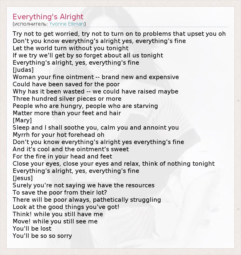 Try not to get worried, try not to turn on to problems that upset you oh Don't you know everything's alright yes, everything's fine Let the world turn without you tonight If we try we'll get by so forget about all us tonight Everything's alright, yes, everything's fine [Judas] Woman your fine ointment -- brand new and expensive Could have been saved for the poor Why has it been wasted -- we could have raised maybe Three hundred silver pieces or more People who are hungry, people who are starving Matter more than your feet and hair [Mary] Sleep and I shall soothe you, calm you and annoint you Myrrh for your hot forehead oh Don't you know everything's alright yes everything's fine And it's cool and the ointment's sweet For the fire in your head and feet Close your eyes, close your eyes and relax, think of nothing tonight Everything's alright, yes, everything's fine [Jesus] Surely you're not saying we have the resources To save the poor from their lot? There will be poor always, pathetically struggling Look at the good things you've got! Think! while you still have me Move! while you still see me You'll be lost You'll be so so sorry