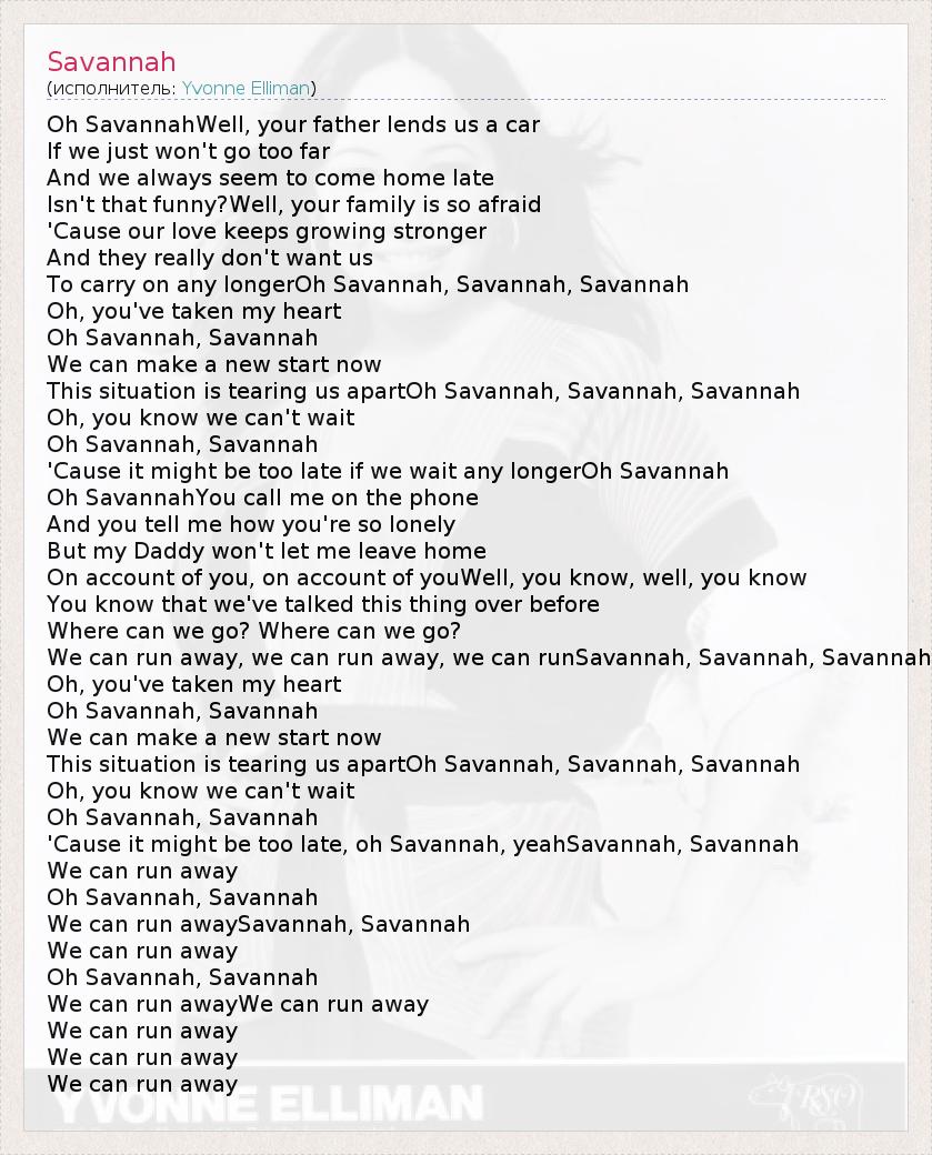Oh SavannahWell, your father lends us a car If we just won't go too far And we always seem to come home late Isn't that funny?Well, your family is so afraid 'Cause our love keeps growing stronger And they really don't want us To carry on any longerOh Savannah, Savannah, Savannah Oh, you've taken my heart Oh Savannah, Savannah We can make a new start now This situation is tearing us apartOh Savannah, Savannah, Savannah Oh, you know we can't wait Oh Savannah, Savannah 'Cause it might be too late if we wait any longerOh Savannah Oh SavannahYou call me on the phone And you tell me how you're so lonely But my Daddy won't let me leave home On account of you, on account of youWell, you know, well, you know You know that we've talked this thing over before Where can we go? Where can we go? We can run away, we can run away, we can runSavannah, Savannah, Savannah Oh, you've taken my heart Oh Savannah, Savannah We can make a new start now This situation is tearing us apartOh Savannah, Savannah, Savannah Oh, you know we can't wait Oh Savannah, Savannah 'Cause it might be too late, oh Savannah, yeahSavannah, Savannah We can run away Oh Savannah, Savannah We can run awaySavannah, Savannah We can run away Oh Savannah, Savannah We can run awayWe can run away We can run away We can run away We can run away