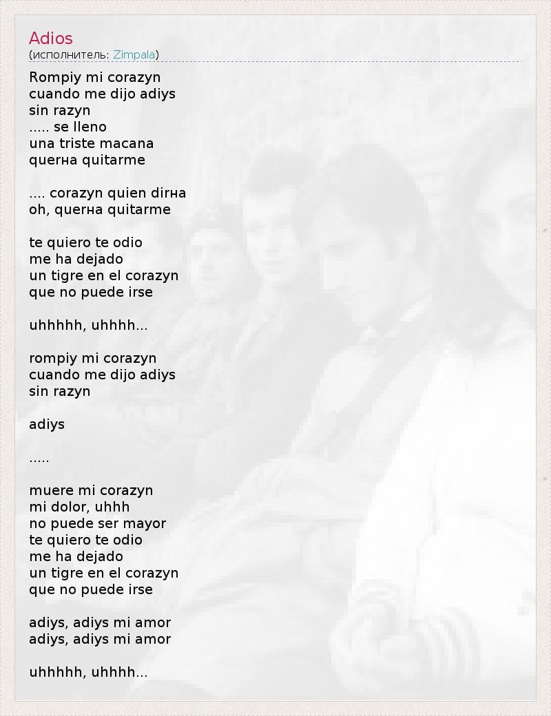 Rompiу mi corazуn cuando me dijo adiуs sin razуn ..... se lleno una triste maсana querнa quitarme .... corazуn quien dirнa oh, querнa quitarme te quiero te odio me ha dejado un tigre en el corazуn que no puede irse uhhhhh, uhhhh... rompiу mi corazуn cuando me dijo adiуs sin razуn adiуs ..... muere mi corazуn mi dolor, uhhh no puede ser mayor te quiero te odio me ha dejado un tigre en el corazуn que no puede irse adiуs, adiуs mi amor adiуs, adiуs mi amor uhhhhh, uhhhh...