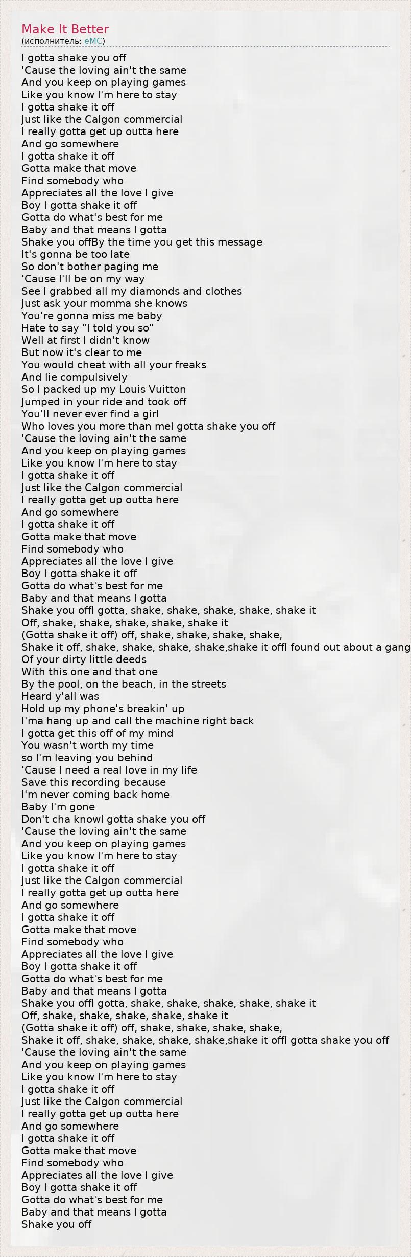 I gotta shake you off 'Cause the loving ain't the same And you keep on playing games Like you know I'm here to stay I gotta shake it off Just like the Calgon commercial I really gotta get up outta here And go somewhere I gotta shake it off Gotta make that move Find somebody who Appreciates all the love I give Boy I gotta shake it off Gotta do what's best for me Baby and that means I gotta Shake you offBy the time you get this message It's gonna be too late So don't bother paging me 'Cause I'll be on my way See I grabbed all my diamonds and clothes Just ask your momma she knows You're gonna miss me baby Hate to say "I told you so" Well at first I didn't know But now it's clear to me You would cheat with all your freaks And lie compulsively So I packed up my Louis Vuitton Jumped in your ride and took off You'll never ever find a girl Who loves you more than meI gotta shake you off 'Cause the loving ain't the same And you keep on playing games Like you know I'm here to stay I gotta shake it off Just like the Calgon commercial I really gotta get up outta here And go somewhere I gotta shake it off Gotta make that move Find somebody who Appreciates all the love I give Boy I gotta shake it off Gotta do what's best for me Baby and that means I gotta Shake you offI gotta, shake, shake, shake, shake, shake it Off, shake, shake, shake, shake, shake it (Gotta shake it off) off, shake, shake, shake, shake, Shake it off, shake, shake, shake, shake,shake it offI found out about a gang Of your dirty little deeds With this one and that one By the pool, on the beach, in the streets Heard y'all was Hold up my phone's breakin' up I'ma hang up and call the machine right back I gotta get this off of my mind You wasn't worth my time so I'm leaving you behind 'Cause I need a real love in my life Save this recording because I'm never coming back home Baby I'm gone Don't cha knowI gotta shake you off 'Cause the loving ain't the same And you keep on playing games Like you know I'm here to stay I gotta shake it off Just like the Calgon commercial I really gotta get up outta here And go somewhere I gotta shake it off Gotta make that move Find somebody who Appreciates all the love I give Boy I gotta shake it off Gotta do what's best for me Baby and that means I gotta Shake you offI gotta, shake, shake, shake, shake, shake it Off, shake, shake, shake, shake, shake it (Gotta shake it off) off, shake, shake, shake, shake, Shake it off, shake, shake, shake, shake,shake it offI gotta shake you off 'Cause the loving ain't the same And you keep on playing games Like you know I'm here to stay I gotta shake it off Just like the Calgon commercial I really gotta get up outta here And go somewhere I gotta shake it off Gotta make that move Find somebody who Appreciates all the love I give Boy I gotta shake it off Gotta do what's best for me Baby and that means I gotta Shake you off