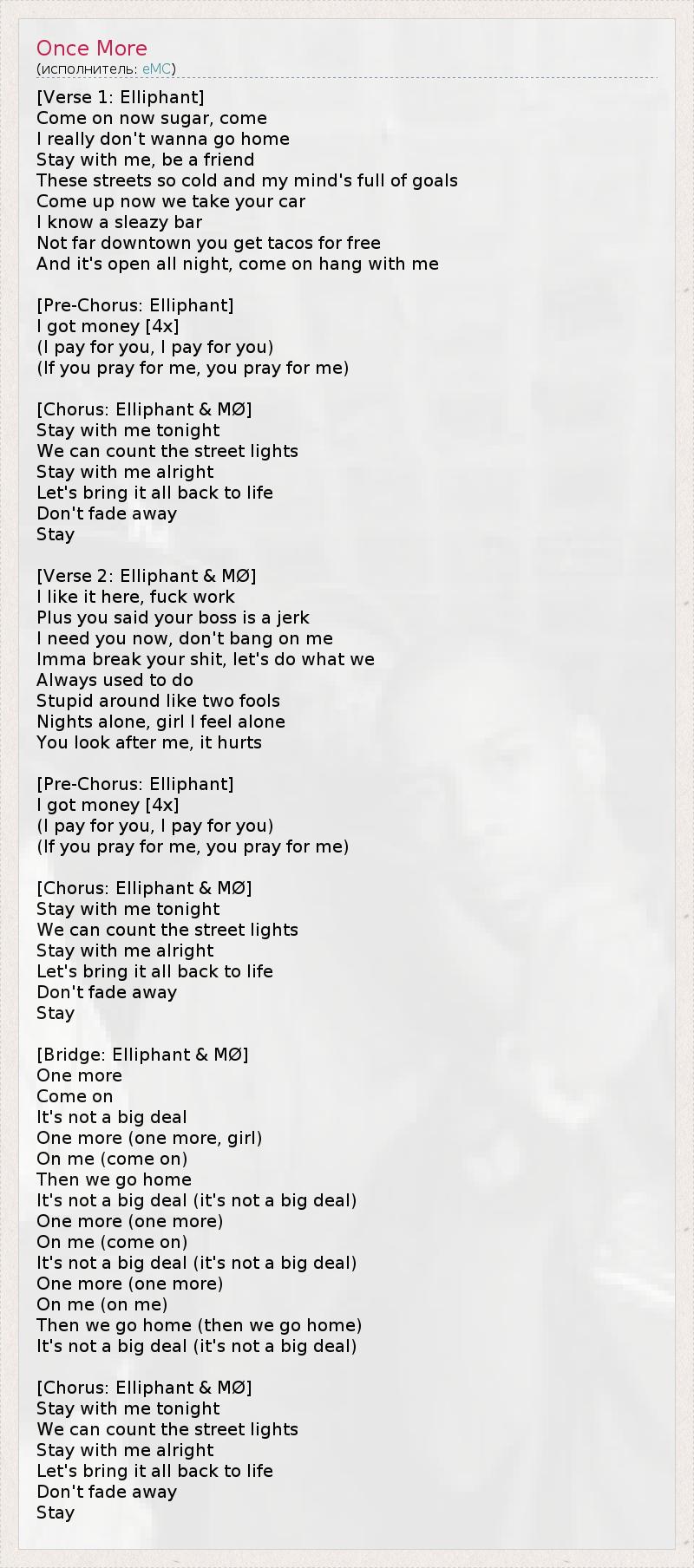 [Verse 1: Elliphant] Come on now sugar, come I really don't wanna go home Stay with me, be a friend These streets so cold and my mind's full of goals Come up now we take your car I know a sleazy bar Not far downtown you get tacos for free And it's open all night, come on hang with me [Pre-Chorus: Elliphant] I got money [4x] (I pay for you, I pay for you) (If you pray for me, you pray for me) [Chorus: Elliphant & MØ] Stay with me tonight We can count the street lights Stay with me alright Let's bring it all back to life Don't fade away Stay [Verse 2: Elliphant & MØ] I like it here, fuck work Plus you said your boss is a jerk I need you now, don't bang on me Imma break your shit, let's do what we Always used to do Stupid around like two fools Nights alone, girl I feel alone You look after me, it hurts [Pre-Chorus: Elliphant] I got money [4x] (I pay for you, I pay for you) (If you pray for me, you pray for me) [Chorus: Elliphant & MØ] Stay with me tonight We can count the street lights Stay with me alright Let's bring it all back to life Don't fade away Stay [Bridge: Elliphant & MØ] One more Come on It's not a big deal One more (one more, girl) On me (come on) Then we go home It's not a big deal (it's not a big deal) One more (one more) On me (come on) It's not a big deal (it's not a big deal) One more (one more) On me (on me) Then we go home (then we go home) It's not a big deal (it's not a big deal) [Chorus: Elliphant & MØ] Stay with me tonight We can count the street lights Stay with me alright Let's bring it all back to life Don't fade away Stay