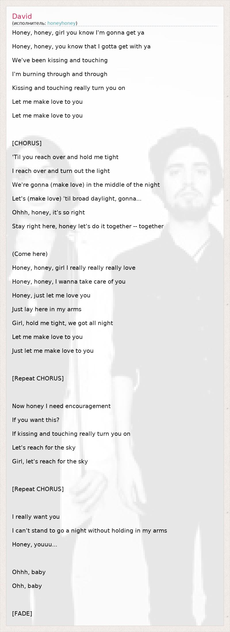 Honey, honey, girl you know I'm gonna get ya Honey, honey, you know that I gotta get with ya We've been kissing and touching I'm burning through and through Kissing and touching really turn you on Let me make love to you Let me make love to you [CHORUS] 'Til you reach over and hold me tight I reach over and turn out the light We're gonna (make love) in the middle of the night Let's (make love) 'til broad daylight, gonna... Ohhh, honey, it's so right Stay right here, honey let's do it together -- together (Come here) Honey, honey, girl I really really really love Honey, honey, I wanna take care of you Honey, just let me love you Just lay here in my arms Girl, hold me tight, we got all night Let me make love to you Just let me make love to you [Repeat CHORUS] Now honey I need encouragement If you want this? If kissing and touching really turn you on Let's reach for the sky Girl, let's reach for the sky [Repeat CHORUS] I really want you I can't stand to go a night without holding in my arms Honey, youuu... Ohhh, baby Ohh, baby [FADE]
