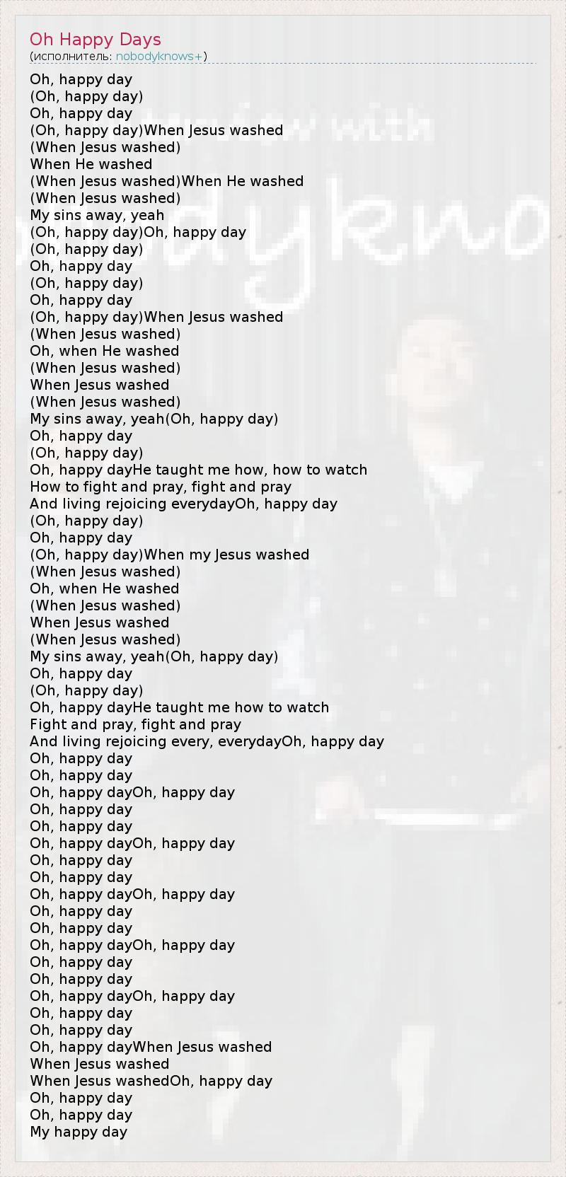 Oh, happy day (Oh, happy day) Oh, happy day (Oh, happy day)When Jesus washed (When Jesus washed) When He washed (When Jesus washed)When He washed (When Jesus washed) My sins away, yeah (Oh, happy day)Oh, happy day (Oh, happy day) Oh, happy day (Oh, happy day) Oh, happy day (Oh, happy day)When Jesus washed (When Jesus washed) Oh, when He washed (When Jesus washed) When Jesus washed (When Jesus washed) My sins away, yeah(Oh, happy day) Oh, happy day (Oh, happy day) Oh, happy dayHe taught me how, how to watch How to fight and pray, fight and pray And living rejoicing everydayOh, happy day (Oh, happy day) Oh, happy day (Oh, happy day)When my Jesus washed (When Jesus washed) Oh, when He washed (When Jesus washed) When Jesus washed (When Jesus washed) My sins away, yeah(Oh, happy day) Oh, happy day (Oh, happy day) Oh, happy dayHe taught me how to watch Fight and pray, fight and pray And living rejoicing every, everydayOh, happy day Oh, happy day Oh, happy day Oh, happy dayOh, happy day Oh, happy day Oh, happy day Oh, happy dayOh, happy day Oh, happy day Oh, happy day Oh, happy dayOh, happy day Oh, happy day Oh, happy day Oh, happy dayOh, happy day Oh, happy day Oh, happy day Oh, happy dayOh, happy day Oh, happy day Oh, happy day Oh, happy dayWhen Jesus washed When Jesus washed When Jesus washedOh, happy day Oh, happy day Oh, happy day My happy day