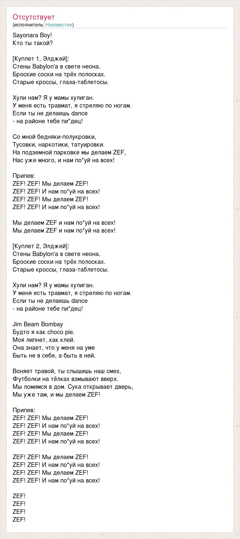 Sayonara Boy! Кто ты такой? [Куплет 1, Элджей]: Стены Babylon'a в свете неона. Броские соски на трёх полосках. Старые кроссы, глаза-таблетосы. Хули нам? Я у мамы хулиган. У меня есть травмат, я стреляю по ногам. Если ты не делаешь dance - на районе тебе пи*дец! Со мной бедняки-полукровки, Тусовки, наркотики, татуировки. На подземной парковке мы делаем ZEF, Нас уже много, и нам по*уй на всех! Припев: ZEF! ZEF! Мы делаем ZEF! ZEF! ZEF! И нам по*уй на всех! ZEF! ZEF! Мы делаем ZEF! ZEF! ZEF! И нам по*уй на всех! Мы делаем ZEF и нам по*уй на всех! Мы делаем ZEF и нам по*уй на всех! [Куплет 2, Элджей]: Стены Babylon'a в свете неона. Броские соски на трёх полосках. Старые кроссы, глаза-таблетосы. Хули нам? Я у мамы хулиган. У меня есть травмат, я стреляю по ногам. Если ты не делаешь dance - на районе тебе пи*дец! Jim Beam Bombay Будто я как choco pie. Моя липнет, как клей. Она знает, что у меня на уме Быть не в себе, а быть в ней. Воняет травой, ты слышишь наш смех, Футболки на тёлках взмывают вверх. Мы ломимся в дом. Сука открывает дверь, Мы уже там, и мы делаем ZEF! Припев: ZEF! ZEF! Мы делаем ZEF! ZEF! ZEF! И нам по*уй на всех! ZEF! ZEF! Мы делаем ZEF! ZEF! ZEF! И нам по*уй на всех! ZEF! ZEF! Мы делаем ZEF! ZEF! ZEF! И нам по*уй на всех! ZEF! ZEF! Мы делаем ZEF! ZEF! ZEF! И нам по*уй на всех! ZEF! ZEF! ZEF! ZEF!