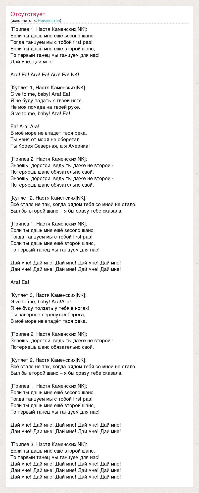 [Припев 1, Настя Каменских|NK]: Если ты дашь мне ещё second шанс, Тогда танцуем мы с тобой first раз! Если ты дашь мне ещё второй шанс, То первый танец мы танцуем для нас! Дай мне, дай мне! Ага! Еа! Ага! Еа! Ага! Еа! NK! [Куплет 1, Настя Каменских|NK]: Give to me, baby! Ага! Еа! Я не буду падать к твоей ноге. Не моя помада на твоей руке. Give to me, baby! Ага! Еа! Еа! А-а! А-а! В моё море не впадет твоя река. Ты меня от моря не оберегал. Ты Корея Северная, а я Америка! [Припев 2, Настя Каменских|NK]: Знаешь, дорогой, ведь ты даже не второй - Потеряешь шанс обязательно свой. Знаешь, дорогой, ведь ты даже не второй - Потеряешь шанс обязательно свой. [Куплет 2, Настя Каменских|NK]: Всё стало не так, когда рядом тебя со мной не стало. Был бы второй шанс – я бы сразу тебе сказала. [Припев 1, Настя Каменских|NK]: Если ты дашь мне ещё second шанс, Тогда танцуем мы с тобой first раз! Если ты дашь мне ещё второй шанс, То первый танец мы танцуем для нас! Дай мне! Дай мне! Дай мне! Дай мне! Дай мне! Дай мне! Дай мне! Дай мне! Дай мне! Дай мне! Ага! Еа! [Куплет 3, Настя Каменских|NK]: Give to me, baby! Ага!Ага! Я не буду ползать у тебя в ногах! Ты наверное перепутал берега, В моё море не впадёт твоя река. [Припев 2, Настя Каменских|NK]: Знаешь, дорогой, ведь ты даже не второй - Потеряешь шанс обязательно свой. [Куплет 2, Настя Каменских|NK]: Всё стало не так, когда рядом тебя со мной не стало. Был бы второй шанс – я бы сразу тебе сказала. [Припев 1, Настя Каменских|NK]: Если ты дашь мне ещё second шанс, Тогда танцуем мы с тобой first раз! Если ты дашь мне ещё второй шанс, То первый танец мы танцуем для нас! Дай мне! Дай мне! Дай мне! Дай мне! Дай мне! Дай мне! Дай мне! Дай мне! Дай мне! Дай мне! [Припев 3, Настя Каменских|NK]: Если ты дашь мне ещё второй шанс, То первый танец мы танцуем для нас! Дай мне! Дай мне! Дай мне! Дай мне! Дай мне! Дай мне! Дай мне! Дай мне! Дай мне! Дай мне! Дай мне! Дай мне! Дай мне! Дай мне! Дай мне!