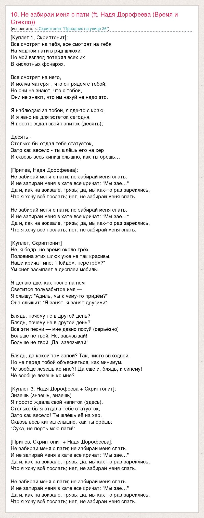[Куплет 1, Скриптонит]: Все смотрят на тебя, все смотрят на тебя На модном пати в ряд шлюхи. Но мой взгляд потерял всех их В кислотных фонарях. Все смотрят на него, И молча матерят, что он рядом с тобой; Но они не знают, что с тобой, Они не знают, что им нахуй не надо это. Я наблюдаю за тобой, я где-то с краю, И я явно не для эстеток сегодня. Я просто ждал свой напиток (десять); Десять - Столько бы отдал тебе статуэток, Зато как весело - ты шлёшь его на хер И сквозь весь кипиш слышно, как ты орёшь… [Припев, Надя Дорофеева]: Не забирай меня с пати; не забирай меня спать. И не запирай меня в хате все кричат: "Мы зае…" Да и, как на вокзале, грязь; да, мы как-то раз зареклись, Что я хочу всё послать; нет, не забирай меня спать. Не забирай меня с пати; не забирай меня спать. И не запирай меня в хате все кричат: "Мы зае…" Да и, как на вокзале, грязь; да, мы как-то раз зареклись, Что я хочу всё послать; нет, не забирай меня спать. [Куплет, Скриптонит] Не, я бодр, но время около трёх. Половина этих шлюх уже не так красивы. Наши кричат мне: "Пойдём, перетрём?" Ум снег засыпает в дисплей мобилы. Я делаю две, как после на нём Светится полузабытое имя — Я слышу: "Адиль, мы к чему-то придём?" Она слышит: "Я занят, я занят другими". Блядь, почему не в другой день? Блядь, почему не в другой день? Все эти песни — мне давно похуй (серьёзно) Больше не твой. Не, завязывай! Больше не твой. Да, завязывай! Блядь, да какой там запой? Так, чисто выходной, Но не перед тобой объясняться, как минимум. Чё вообще лезешь ко мне?! Да ещё и, блядь, к синему! Чё вообще лезешь ко мне? [Куплет 3, Надя Дорофеева + Скриптонит]: Знаешь (знаешь, знаешь) Я просто ждала свой напиток (здесь). Столько бы я отдала тебе статуэток, Зато как весело! Ты шлёшь её на хер. Сквозь весь кипиш слышно, как ты орёшь: "Сука, не порть мою пати!" [Припев, Скриптонит + Надя Дорофеева]: Не забирай меня с пати; не забирай меня спать. И не запирай меня в хате все кричат: "Мы зае…" Да и, как на вокзале, грязь; да, мы как-то раз зареклись, Что я хочу всё послать; нет, не забирай меня спать. Не забирай меня с пати; не забирай меня спать. И не запирай меня в хате все кричат: "Мы зае…" Да и, как на вокзале, грязь; да, мы как-то раз зареклись, Что я хочу всё послать; нет, не забирай меня спать.