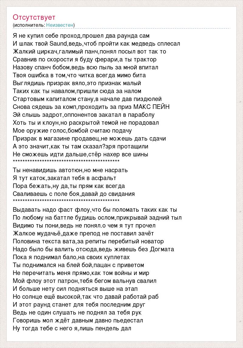 Я не купил себе проход,прошел два раунда сам И шлак твой Saund,ведь,чтоб пройти как медведь сплесал Жалкий циркач,галимый панч,понял посыл вот так то Сравнив по скорости я буду ферари,а ты трактор Назову спанч бобом,ведь всю пыль за мной впитал Твоя ошибка в том,что читка всегда мимо бита Выглядишь призрак вяло,это признак малый Таких как ты навалом,пришли сюда за налом Стартовым капиталом стану,в начале дав пиздюлей Снова сядешь за комп,проходить за приз МАКС ПЕЙН Эй слышь задрот,оппонентов закатал в параболу Хоть ты и клоун,но раскрытой темой не порадовал Мое оружие голос,бомбой считаю подачу Призрак в магазине продавец,не можешь дать сдачи А это значит,как ты там сказал?зря протащили Не сможешь идти дальше,стёр нахер все шины ******************************************** Ты ненавидишь автотюн,но мне насрать Я тут каток,закатал тебя в асфальт Пора бежать,ну да,ты прям как всегда Сваливаешь с поле боя,давай до свидания ******************************************** Выдавать надо фаст флоу,что бы поломать таких как ты По любому на баттле будишь ослом,прикрывай задний тыл Видимо ты пони,ведь не понял.о чем я тут прочел Жалкое мудачьё,даже препод не поставил зачёт Половина текста вата,за репиты перебитый новатор Надо было бы валить отсюда,ведь живешь без Догмата Пока я поднимал бало,на своих куплетах Ты поднимался на блей бой,пацан с приветом Не перечитать меня прямо,как том войны и мир Мой флоу этот патрон,тебя бегом вальнув свалил И больше нету сил подняться выше на этап Но солнце ещё высокой,так что давай работай раб И этот раунд станет для тебя последним друг Ведь не один слушать не поднял за тебя рук Говоришь мол ждёт давным давно пьедестал Ну тогда тебе с него я,лишь пендель дал