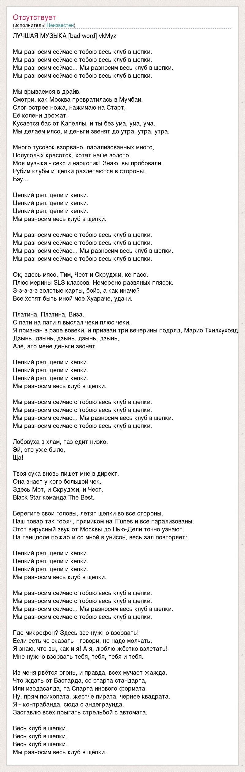 ЛУЧШАЯ МУЗЫКА [bad word] vkMyz Мы разносим сейчас с тобою весь клуб в щепки. Мы разносим сейчас с тобою весь клуб в щепки. Мы разносим сейчас... Мы разносим весь клуб в щепки. Мы разносим сейчас с тобою весь клуб в щепки. Мы врываемся в драйв. Смотри, как Москва превратилась в Мумбаи. Слог острее ножа, нажимаю на Старт, Её колени дрожат. Кусается бас от Капеллы, и ты без ума, ума, ума. Мы делаем мясо, и деньги звенят до утра, утра, утра. Много тусовок взорвано, парализованных много, Полуголых красоток, хотят наше золото. Моя музыка - секс и наркотик! Знаю, вы пробовали. Рубим клубы и щепки разлетаются в стороны. Бэу... Цепкий рэп, цепи и кепки. Цепкий рэп, цепи и кепки. Цепкий рэп, цепи и кепки. Мы разносим весь клуб в щепки. Мы разносим сейчас с тобою весь клуб в щепки. Мы разносим сейчас с тобою весь клуб в щепки. Мы разносим сейчас... Мы разносим весь клуб в щепки. Мы разносим сейчас с тобою весь клуб в щепки. Ок, здесь мясо, Тим, Чест и Скруджи, ке пасо. Плюс мерины SLS классов. Немерено развяных плясок. З-з-з-з-з золотые карты, бойс, а как иначе? Все хотят быть мной мое Хуараче, удачи. Платина, Платина, Виза. С пати на пати я выслал чеки плюс чеки. Я признан в рэпе вовеки, и призван три вечерины подряд, Марио Тхилхухояд. Дзынь, дзынь, дзынь, дзынь, дзынь, Алё, это мене деньги звонят. Цепкий рэп, цепи и кепки. Цепкий рэп, цепи и кепки. Цепкий рэп, цепи и кепки. Мы разносим весь клуб в щепки. Мы разносим сейчас с тобою весь клуб в щепки. Мы разносим сейчас с тобою весь клуб в щепки. Мы разносим сейчас... Мы разносим весь клуб в щепки. Мы разносим сейчас с тобою весь клуб в щепки. Лобовуха в хлам, таз едит низко. Эй, это уже было, Ща! Твоя сука вновь пишет мне в директ, Она знает у кого большой чек. Здесь Мот, и Скруджи, и Чест, Black Star команда The Best. Берегите свои головы, летят щепки во все стороны. Наш товар так горяч, прямиком на ITunes и все парализованы. Этот вирусный звук от Москвы до Нью-Дели точно узнают. На танцполе пожар и со мной в унисон, весь зал повторяет: Цепкий рэп, цепи и кепки. Цепкий рэп, цепи и кепки. Цепкий рэп, цепи и кепки. Мы разносим весь клуб в щепки. Мы разносим сейчас с тобою весь клуб в щепки. Мы разносим сейчас с тобою весь клуб в щепки. Мы разносим сейчас... Мы разносим весь клуб в щепки. Мы разносим сейчас с тобою весь клуб в щепки. Где микрофон? Здесь все нужно взорвать! Если есть че сказать - говори, не надо молчать. Я знаю, что вы, как и я! А я, люблю жёстко взлетать! Мне нужно взорвать тебя, тебя, тебя и тебя. Из меня рвётся огонь, и правда, всех мучает жажда, Что ждать от Бастарда, со старта стандарта, Или изодасалда, та Спарта инового формата. Ну, прям психопата, жестче пирата, чернее квадрата. Я - контрабанда, сюда с андеграунда, Заставлю всех прыгать стрельбой с автомата. Весь клуб в щепки. Весь клуб в щепки. Весь клуб в щепки. Мы разносим весь клуб в щепки.